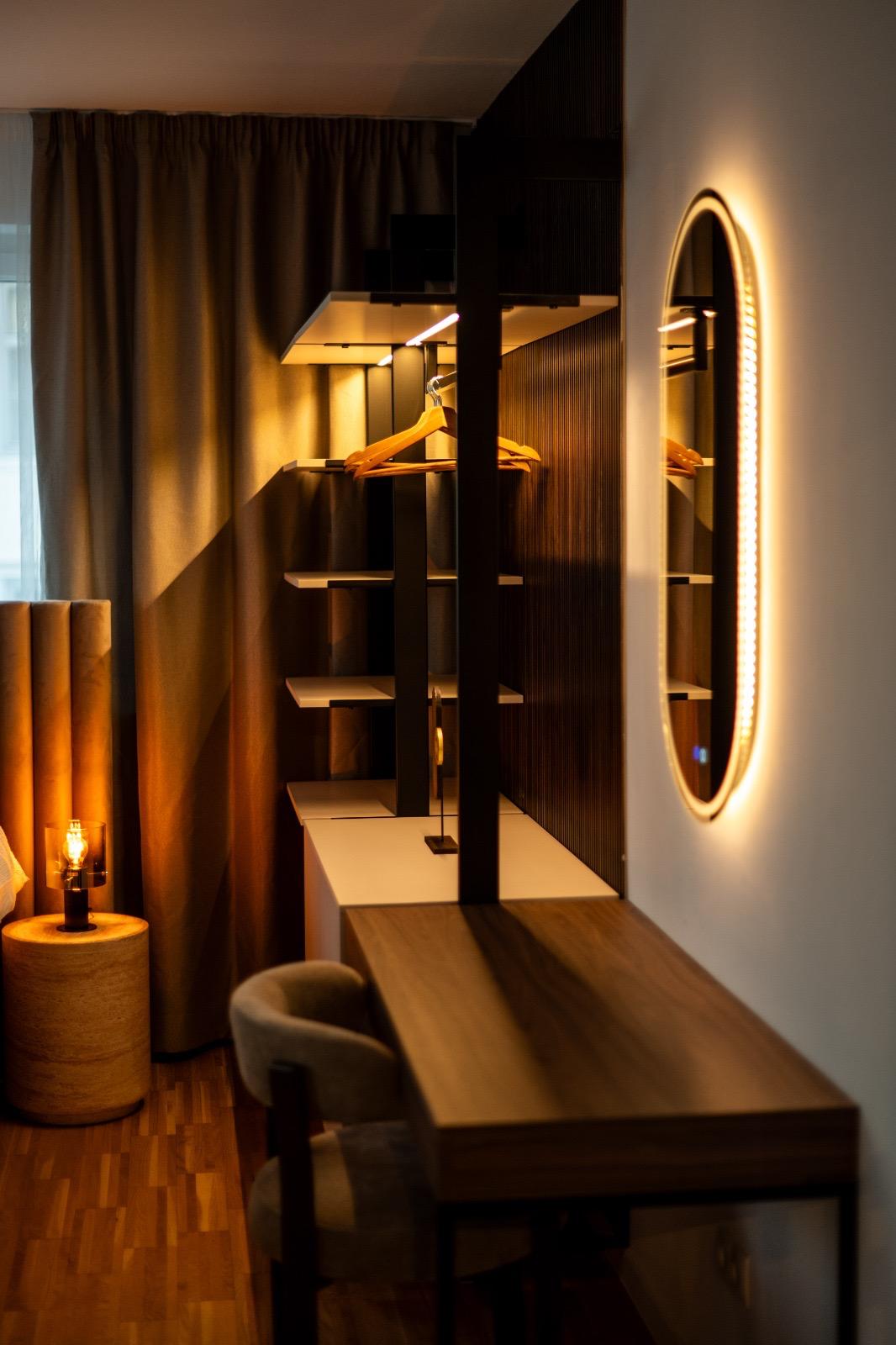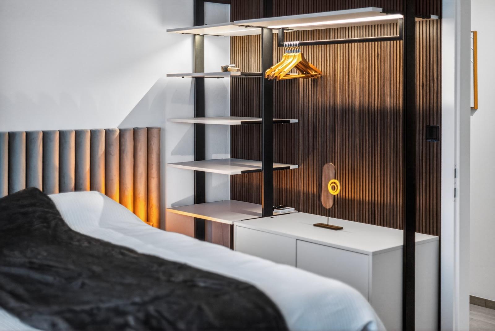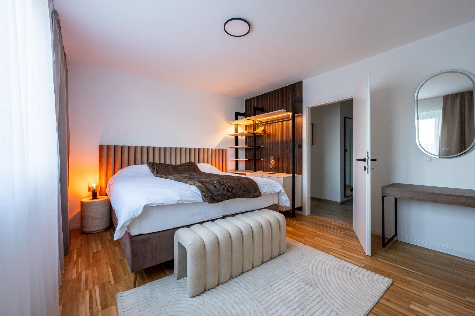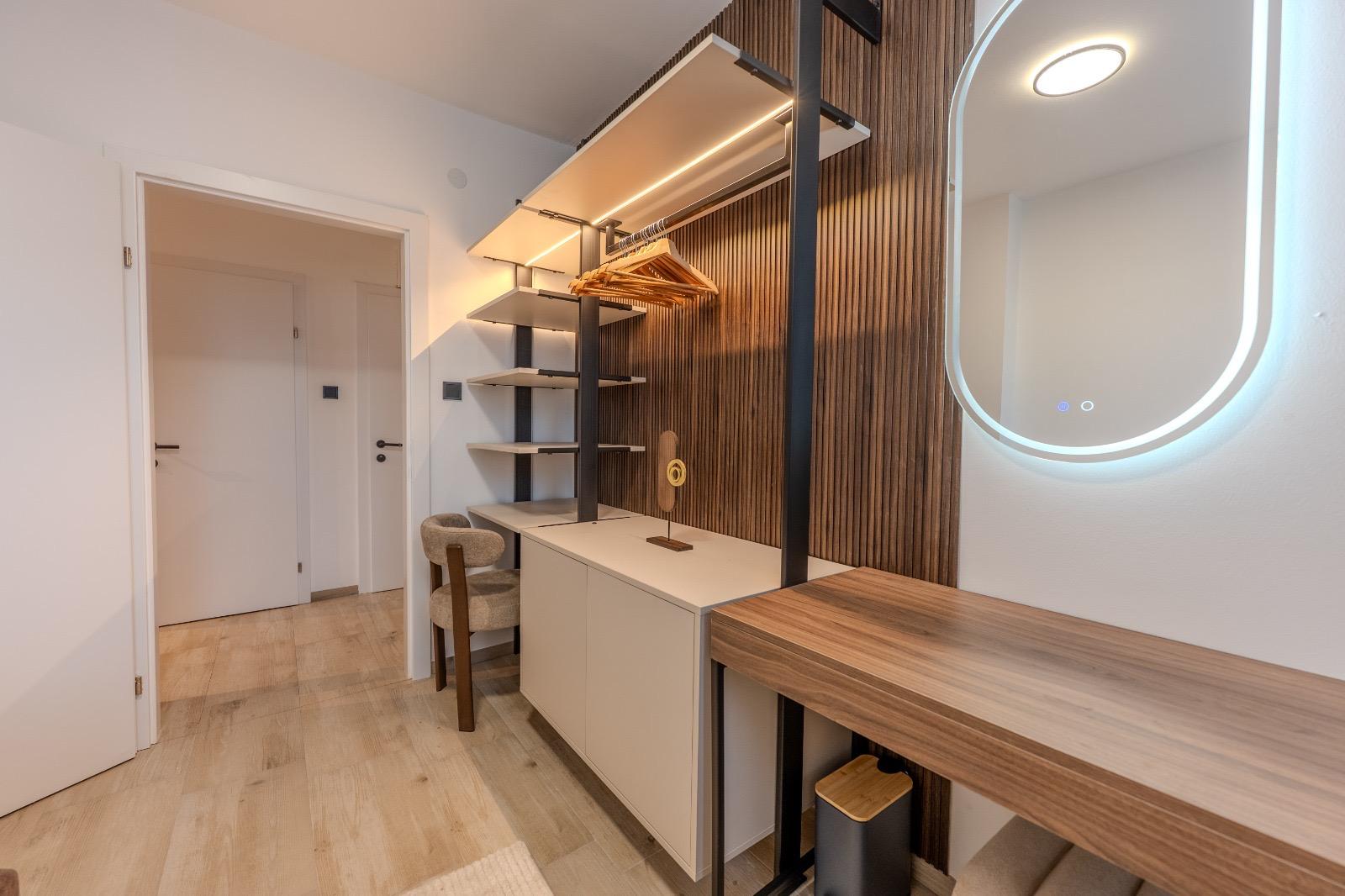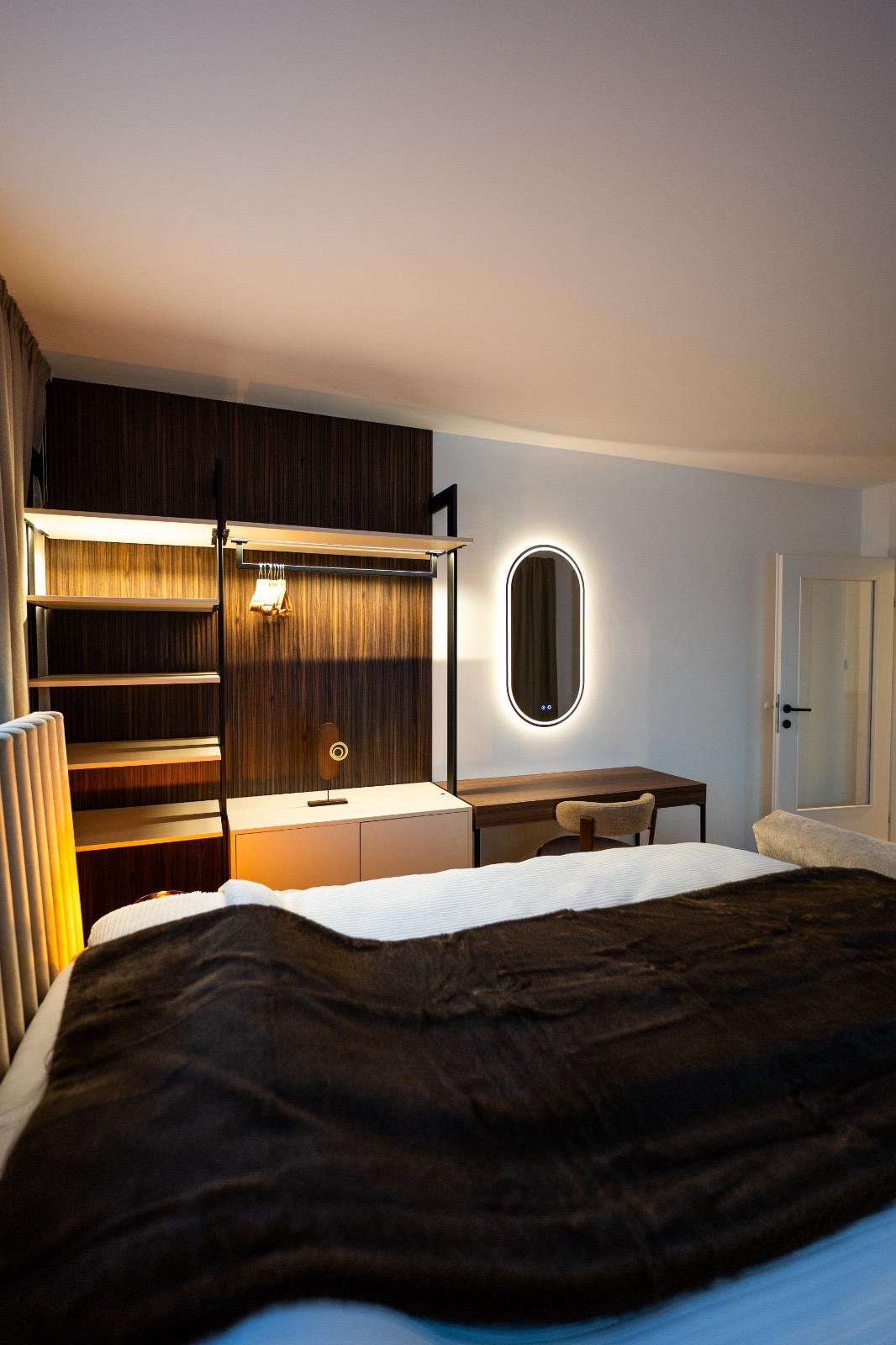 Schlafkomfort auf Hotel-Niveau In den Schlafbereichen haben wir den Fokus auf Texturen und Lichtdesign gelegt. Die maßgefertigten Polsterbetten mit vertikal gesteppten Kopfteilen fungieren als optisches Highlight und verleihen den Räumen Tiefe. Besonders stolz sind wir auf das offene Schranksystem mit integrierter Hintergrundbeleuchtung. Diese Lösung wirkt deutlich luftiger als klassische Kleiderschränke und bietet den Gästen dennoch ausreichend Platz und Komfort. Ergänzt wird das Konzept durch smarte Details wie schwebende Schminktische und hinterleuchtete Spiegel, die den exklusiven Charakter unterstreichen.