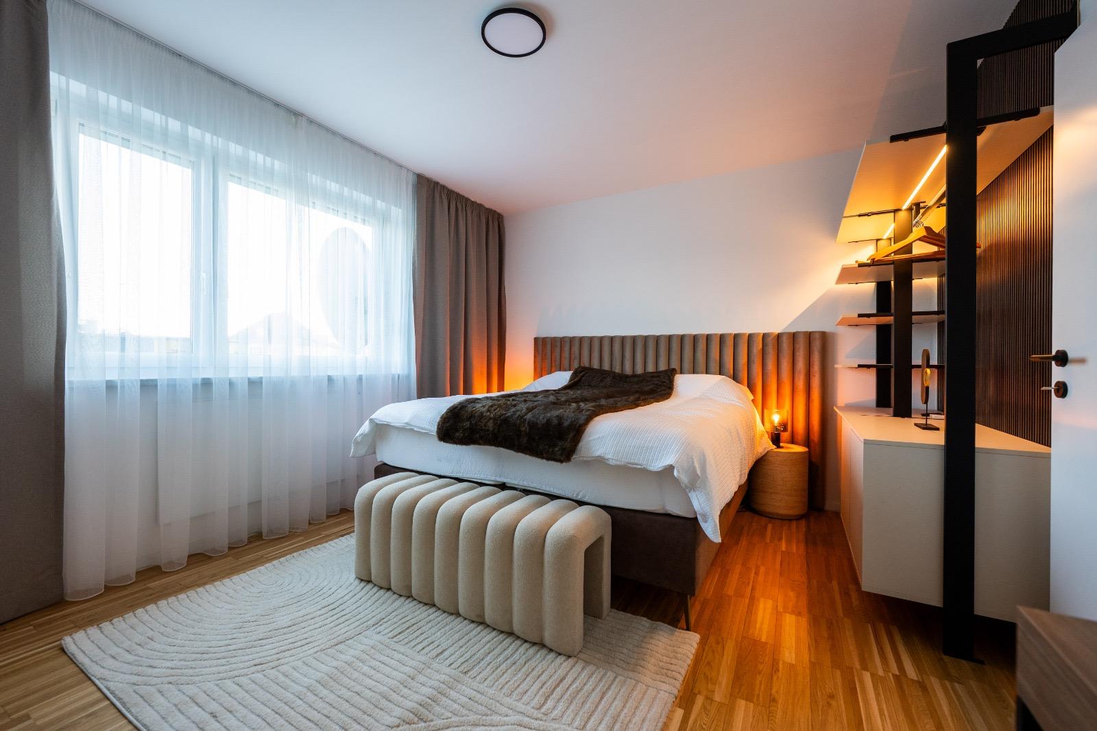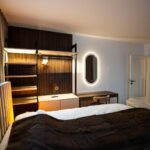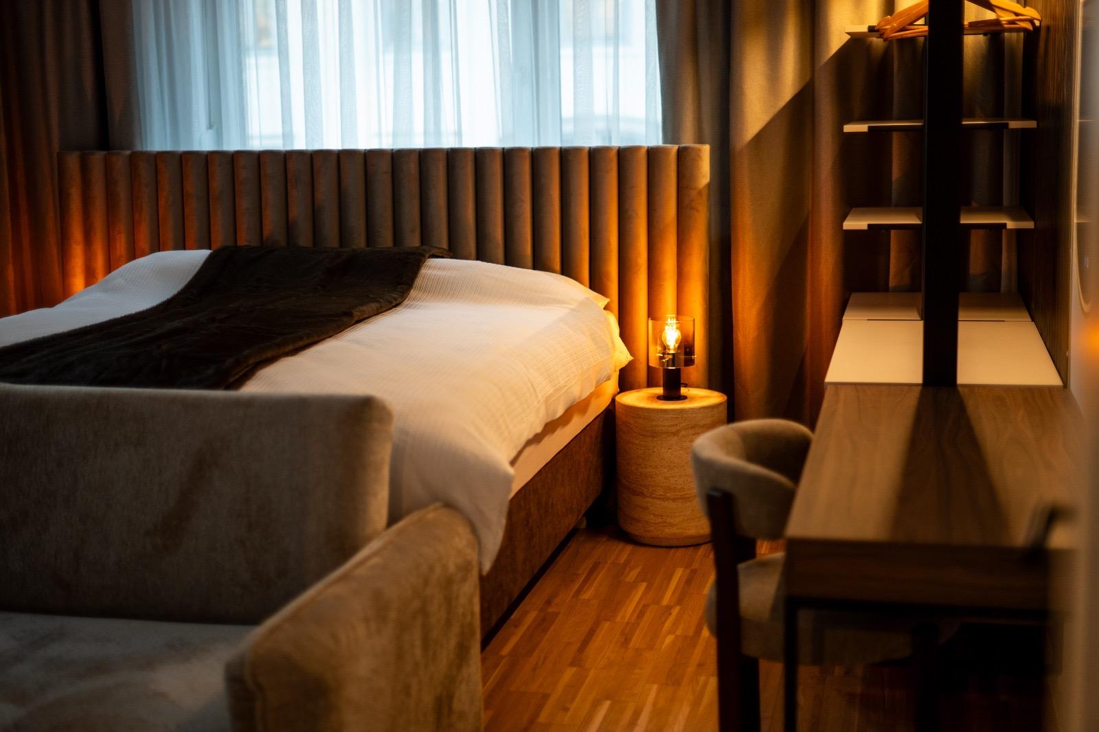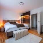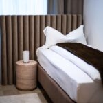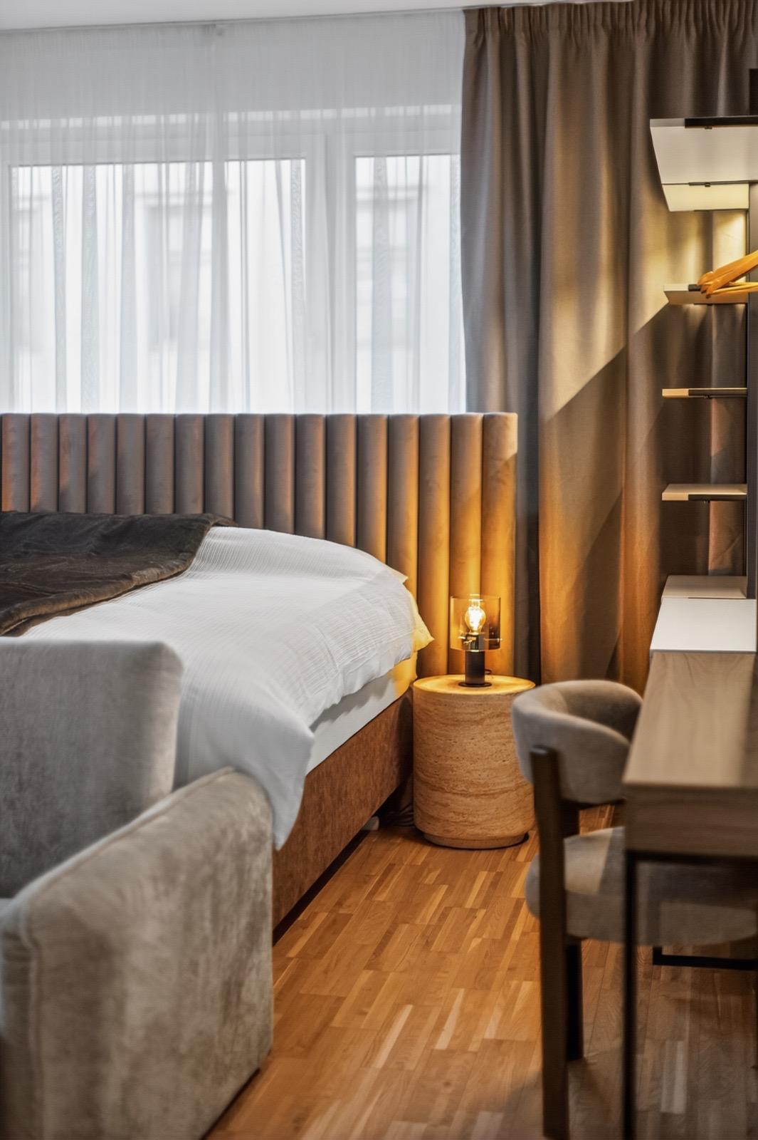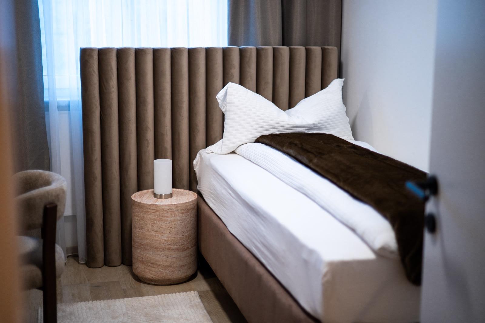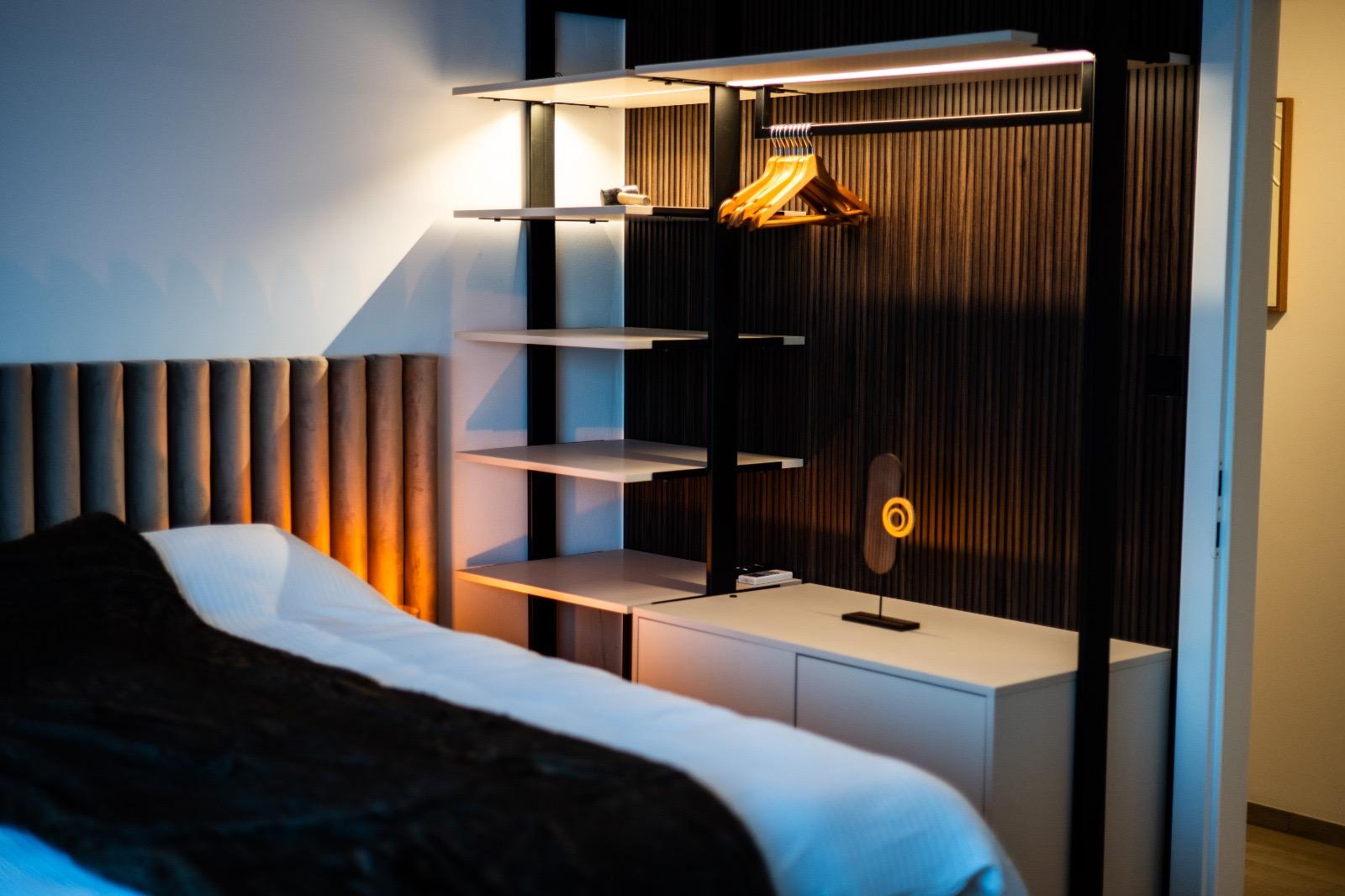 Schlafkomfort auf Hotel-Niveau In den Schlafbereichen haben wir den Fokus auf Texturen und Lichtdesign gelegt. Die maßgefertigten Polsterbetten mit vertikal gesteppten Kopfteilen fungieren als optisches Highlight und verleihen den Räumen Tiefe. Besonders stolz sind wir auf das offene Schranksystem mit integrierter Hintergrundbeleuchtung. Diese Lösung wirkt deutlich luftiger als klassische Kleiderschränke und bietet den Gästen dennoch ausreichend Platz und Komfort. Ergänzt wird das Konzept durch smarte Details wie schwebende Schminktische und hinterleuchtete Spiegel, die den exklusiven Charakter unterstreichen.