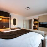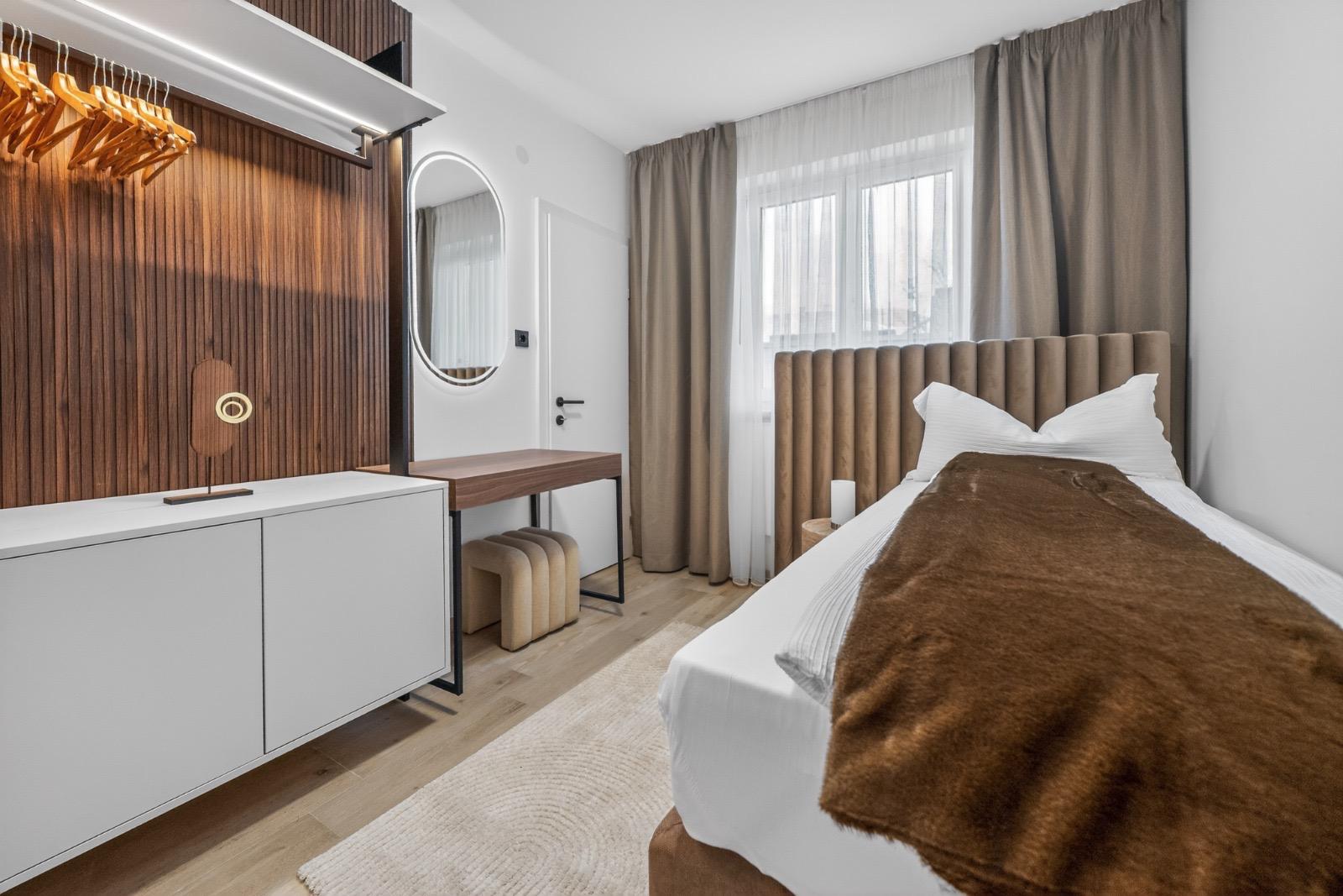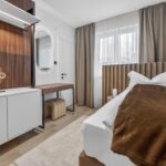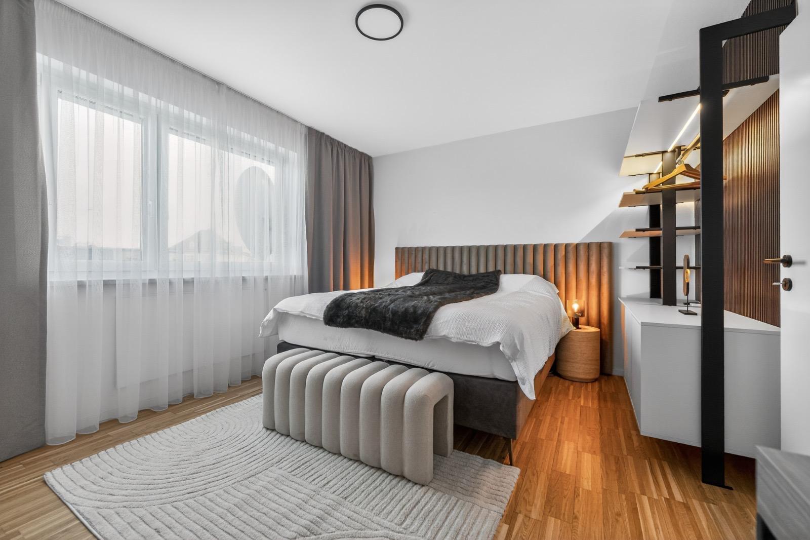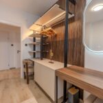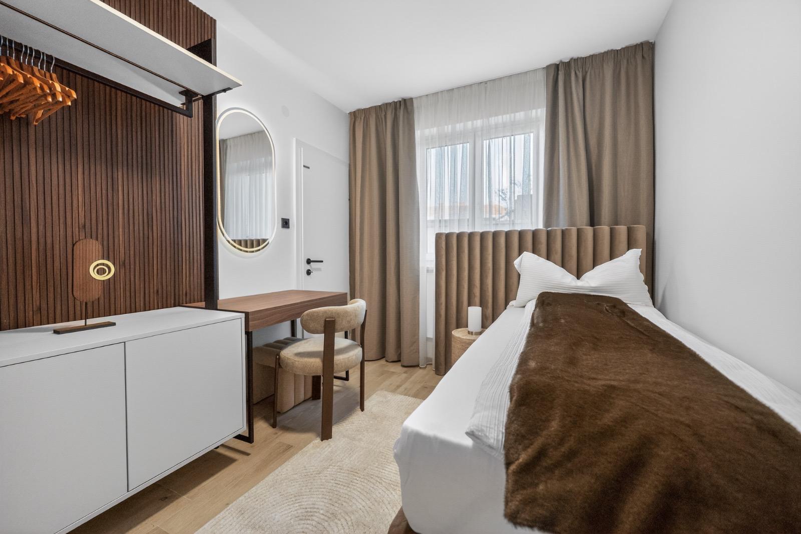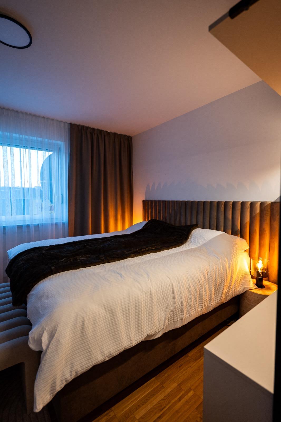 Schlafkomfort auf Hotel-Niveau In den Schlafbereichen haben wir den Fokus auf Texturen und Lichtdesign gelegt. Die maßgefertigten Polsterbetten mit vertikal gesteppten Kopfteilen fungieren als optisches Highlight und verleihen den Räumen Tiefe. Besonders stolz sind wir auf das offene Schranksystem mit integrierter Hintergrundbeleuchtung. Diese Lösung wirkt deutlich luftiger als klassische Kleiderschränke und bietet den Gästen dennoch ausreichend Platz und Komfort. Ergänzt wird das Konzept durch smarte Details wie schwebende Schminktische und hinterleuchtete Spiegel, die den exklusiven Charakter unterstreichen.