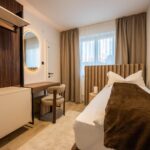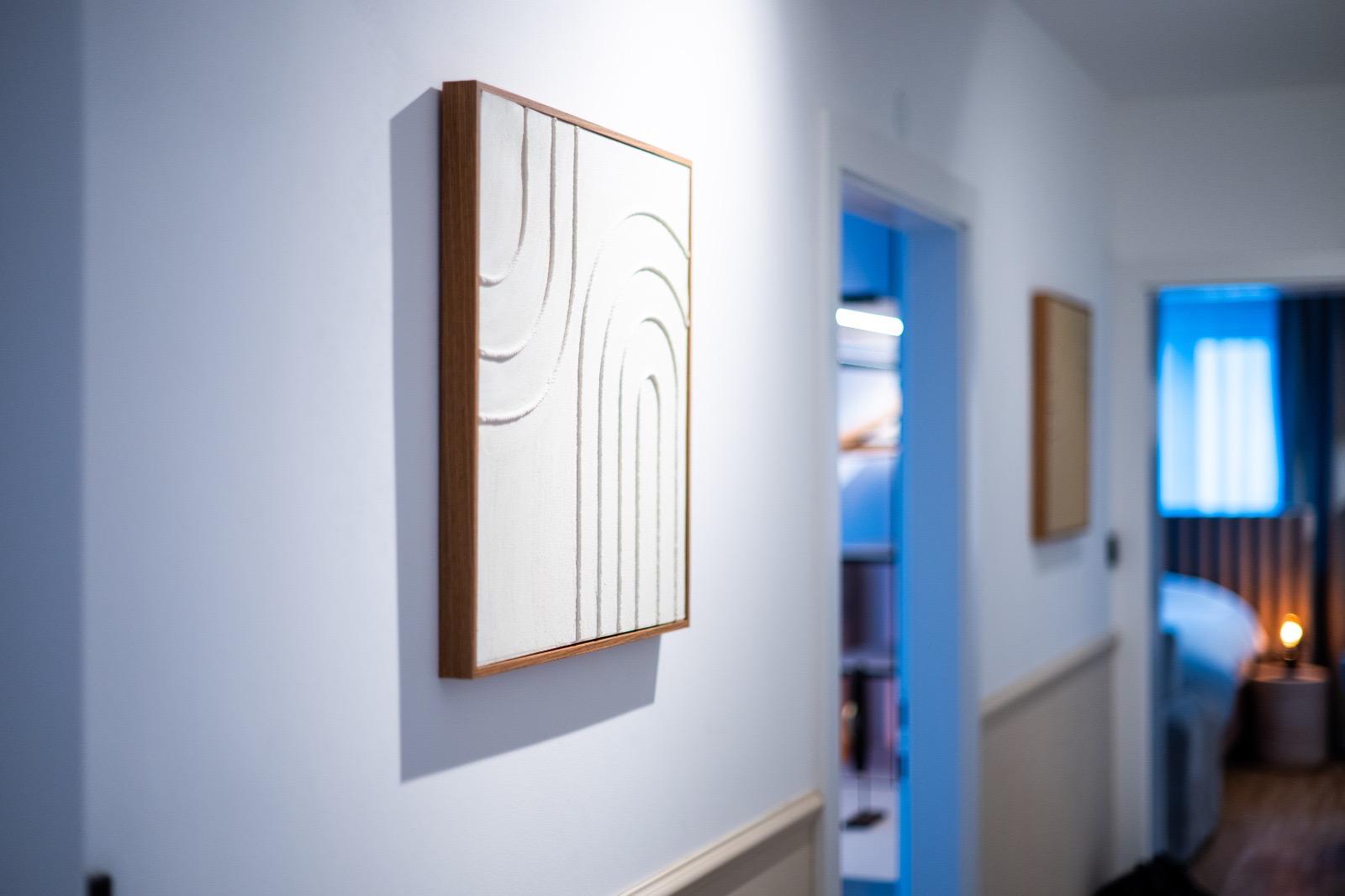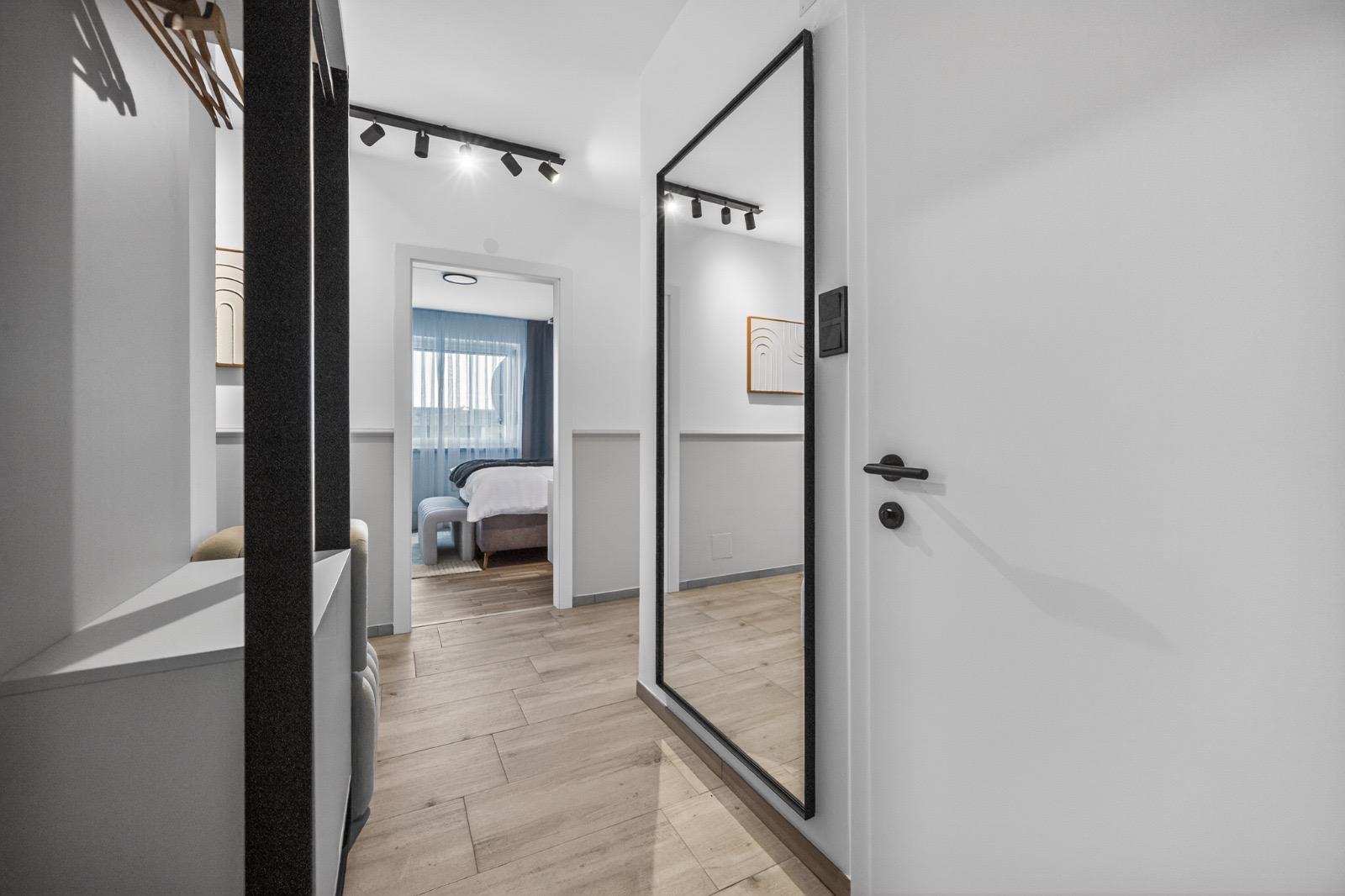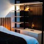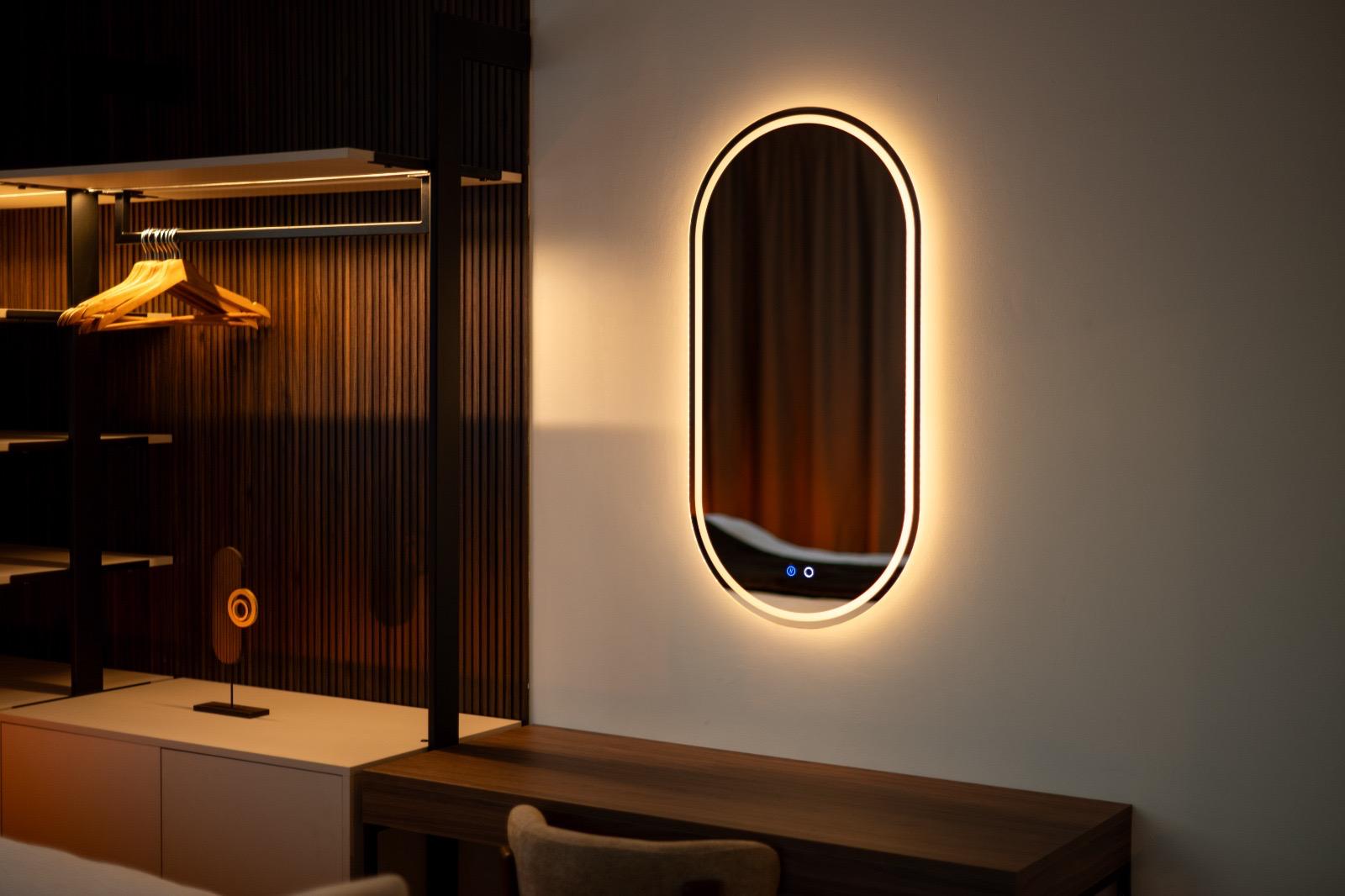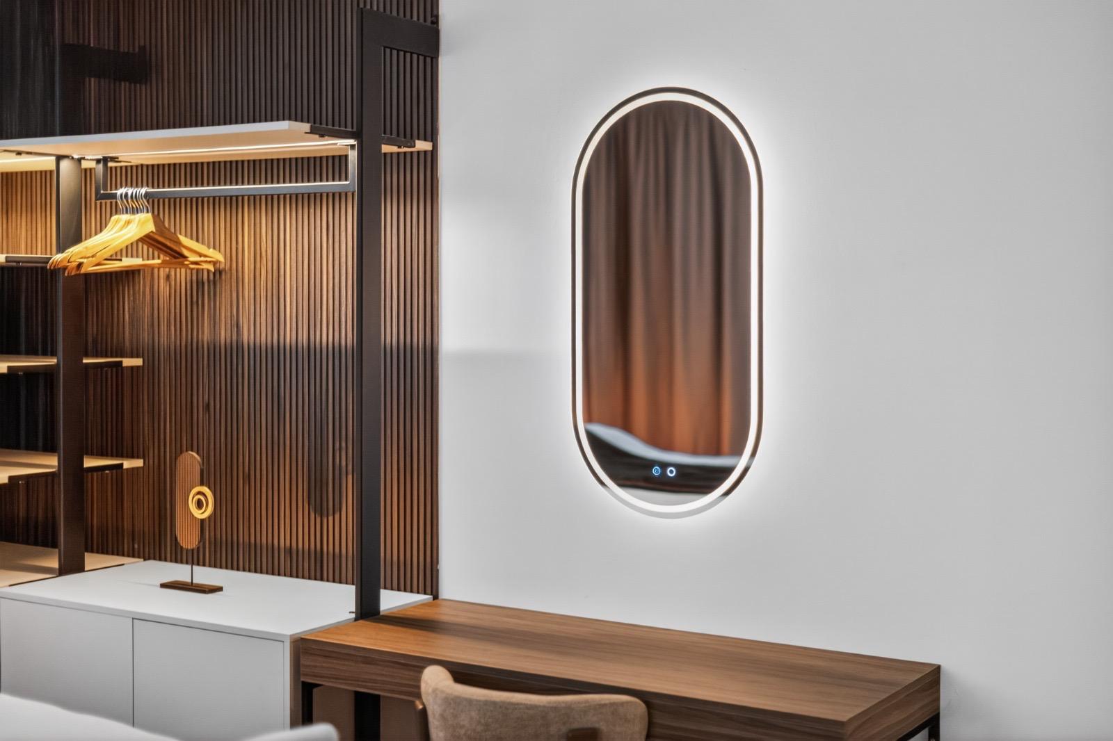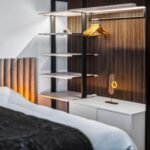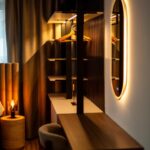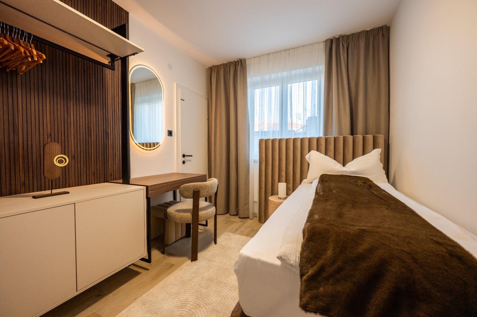 Schlafkomfort auf Hotel-Niveau In den Schlafbereichen haben wir den Fokus auf Texturen und Lichtdesign gelegt. Die maßgefertigten Polsterbetten mit vertikal gesteppten Kopfteilen fungieren als optisches Highlight und verleihen den Räumen Tiefe. Besonders stolz sind wir auf das offene Schranksystem mit integrierter Hintergrundbeleuchtung. Diese Lösung wirkt deutlich luftiger als klassische Kleiderschränke und bietet den Gästen dennoch ausreichend Platz und Komfort. Ergänzt wird das Konzept durch smarte Details wie schwebende Schminktische und hinterleuchtete Spiegel, die den exklusiven Charakter unterstreichen.