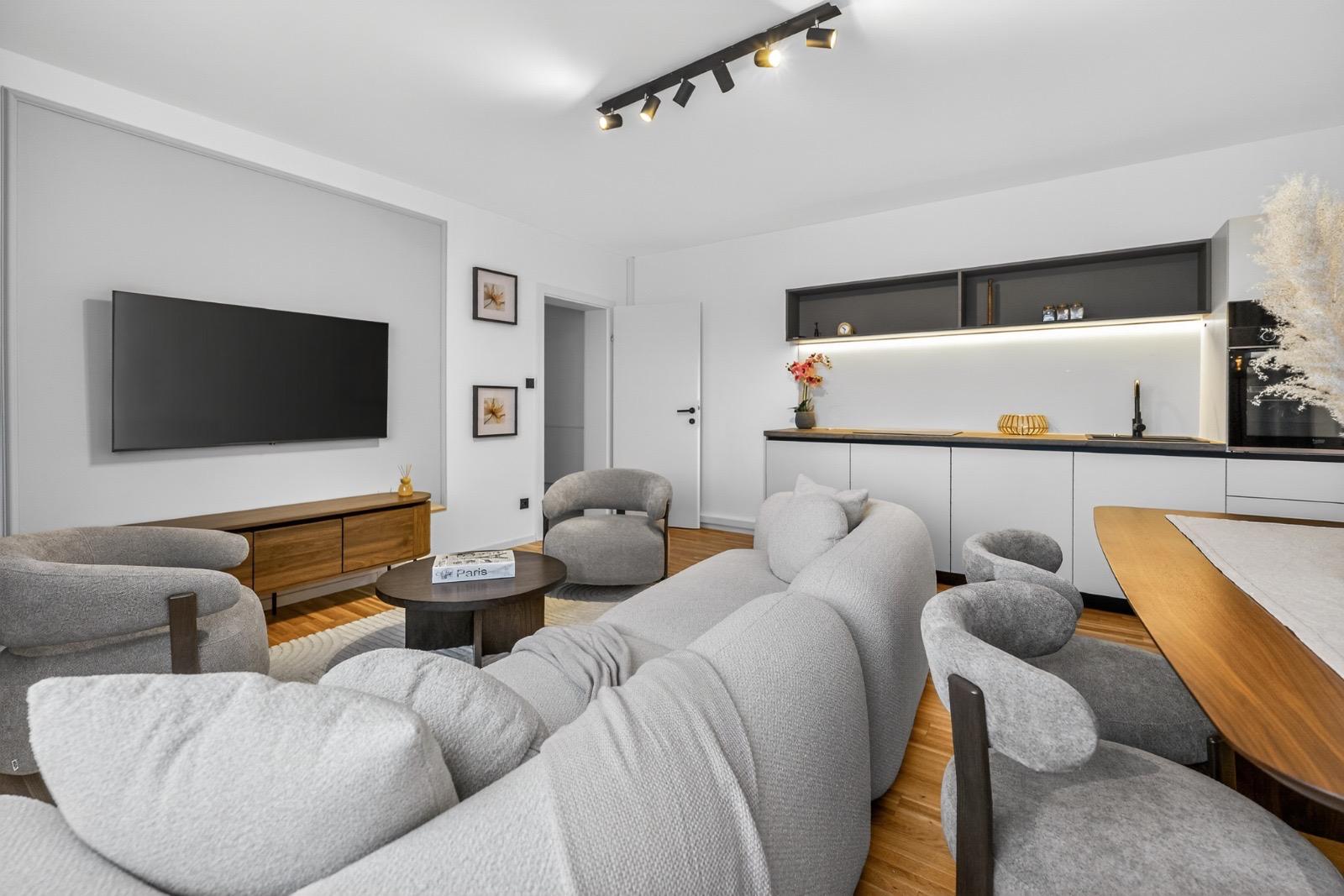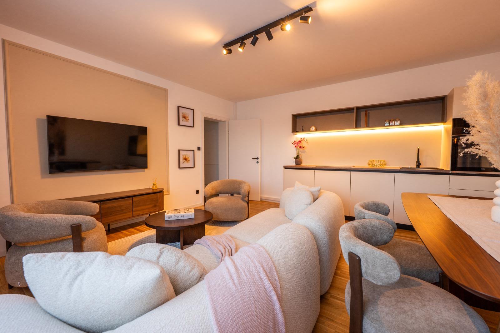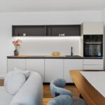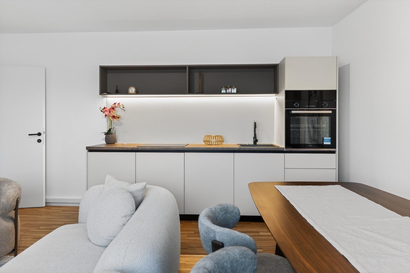 Maßgefertigte Lösungen für höchste Ansprüche In diesem Apartment war das Ziel klar definiert: Eine Symbiose aus moderner Ästhetik und maximaler Funktionalität zu schaffen. Das Herzstück der Wohneinheit ist die minimalistische Design-Küche. Hier haben wir auf klare Linien und eine dezente Farbauswahl gesetzt, die durch warme Holzakzente auf der Arbeitsplatte unterbrochen wird. Die integrierte LED-Beleuchtung unter den Oberschränken sorgt nicht nur für ein perfektes Arbeitslicht, sondern schafft am Abend eine stimmungsvolle Atmosphäre im offenen Wohnbereich.