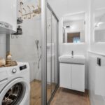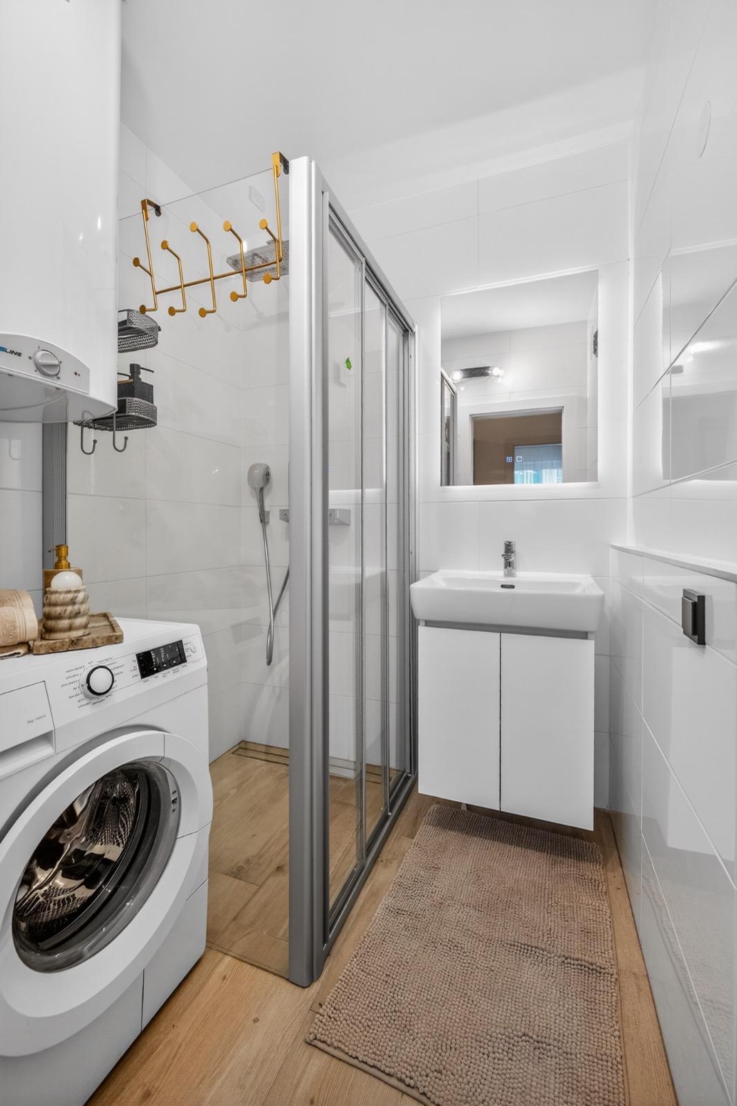 Funktionalität bis ins kleinste Detail Auch in den funktionalen Bereichen wie dem Badezimmer haben wir keine Kompromisse gemacht. Durch die geschickte Integration der Waschmaschine und die Wahl hochwertiger Armaturen in Gold-Optik wirkt selbst ein kompakter Raum luxuriös und aufgeräumt.